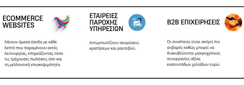 Στην πράξη, κάθε λεπτό που ένα website παραμένει εκτός λειτουργίας μεταφράζεται σε συγκεκριμένες οικονομικές απώλειες. Ενδεικτικά, η Gartner υπολογίζει ότι οι μεγάλες επιχειρήσεις χάνουν κατά μέσο όρο 5.600 δολάρια για κάθε λεπτό διακοπής.