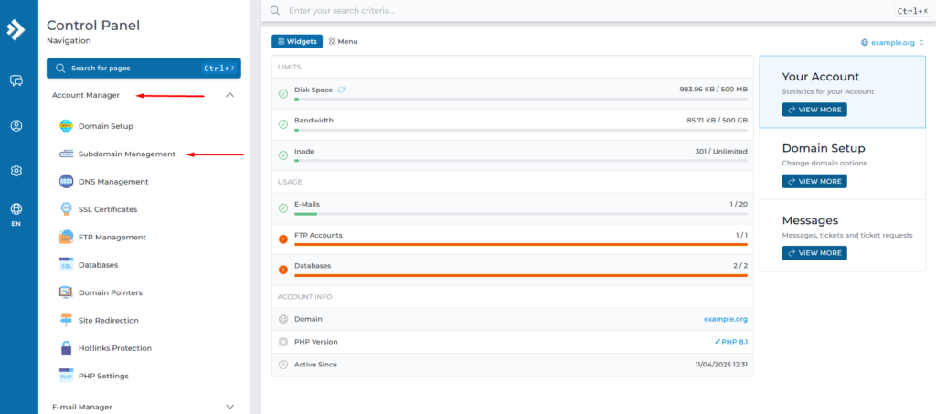 - Πάμε στο Subdomain Management.