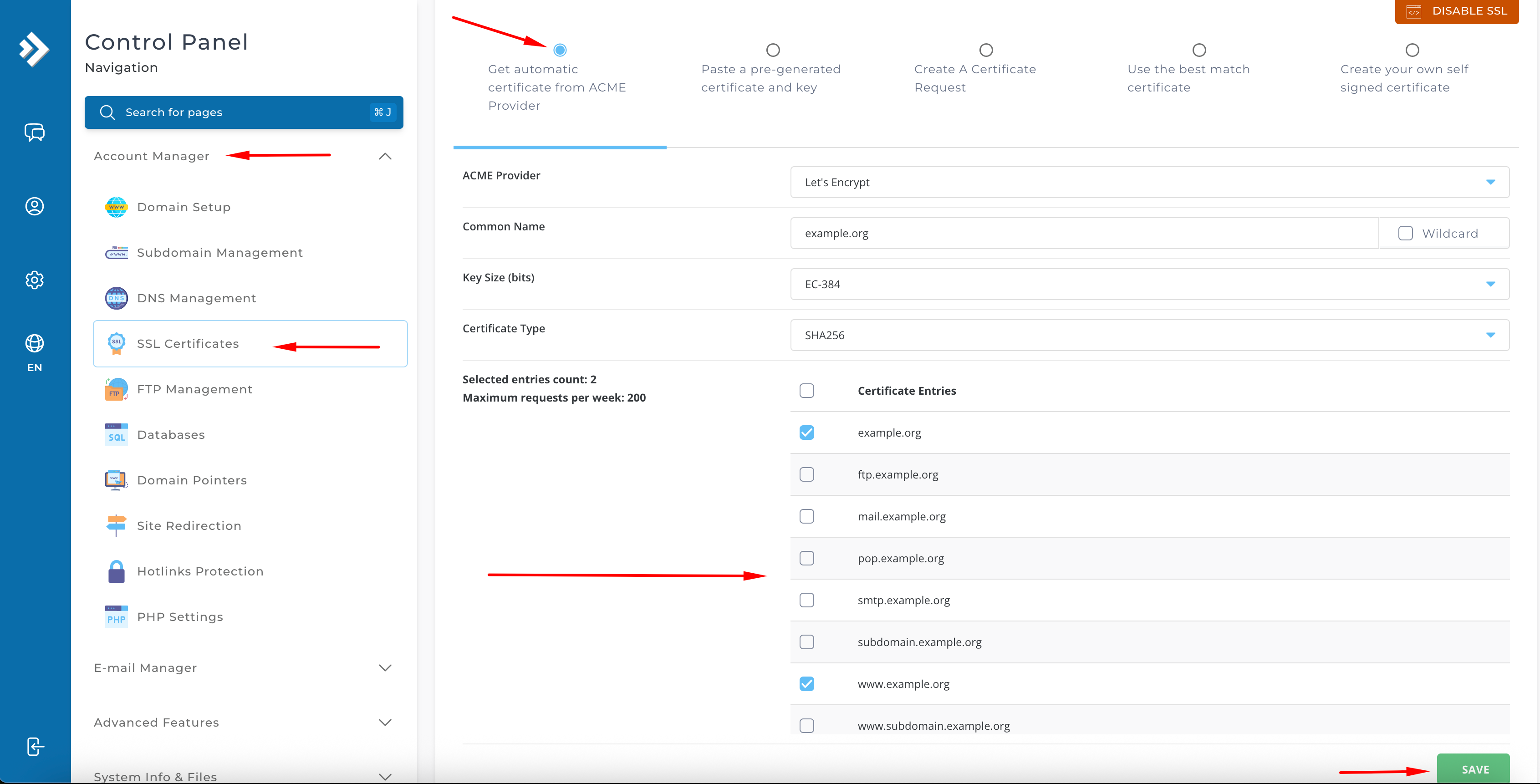 - Στα Certificate Entries επιλέγουμε όλα τα hostnames στα οποία θέλουμε να εφαρμόζεται το SSL. Συνήθως αρκεί να τα επιλέξουμε όλα. Αν όμως τα DNS βρίσκονται αλλού τότε επιλέγουμε μόνο τα hostnames που κάνουν resolve στον εν λόγω hosting server.