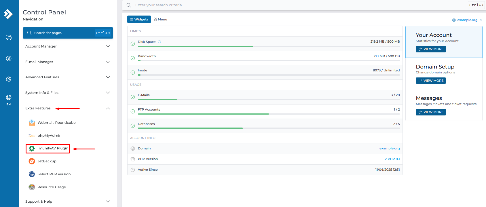 Εκεί επιλέγουμε “ImunifyAV Plugin” από το μενού Extra Features και στη συνέχεια μεταφερόμαστε στο περιβάλλον του ImunifyAV+.