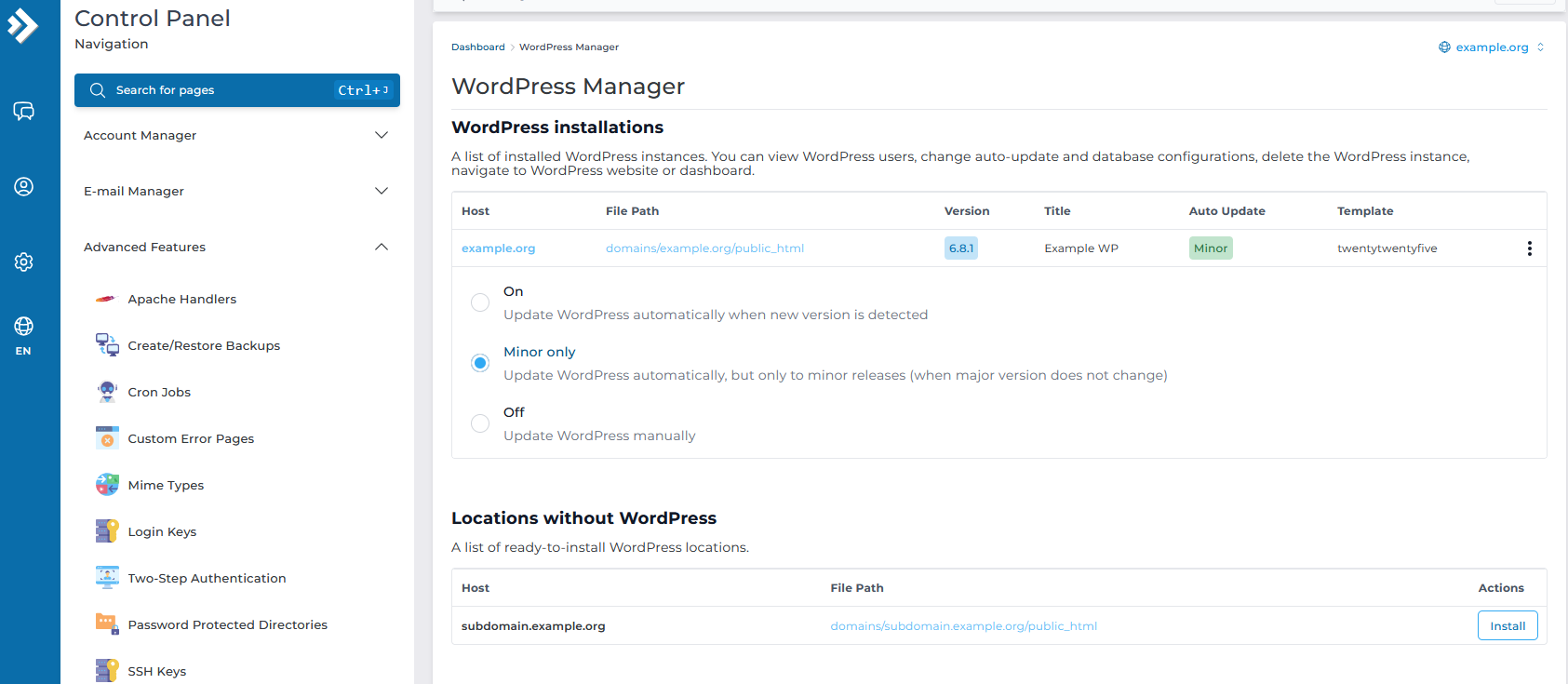 – Auto update default On (προτείνουμε να είναι Off ή Minor Only)![directadmin wordpress manager with one installation]()