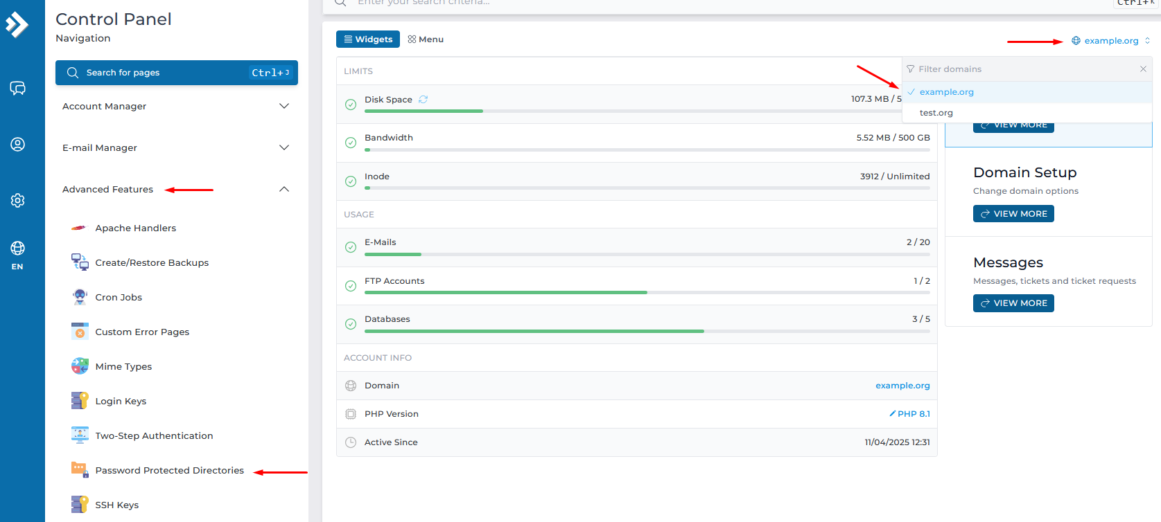 2. Επιλέγουμε το κύριο domain που θέλουμε να ασφαλίσουμε και στη συνέχεια επιλέγουμε Password Protected Directories από την κατηγορία Advanced Features.select password pretected directories