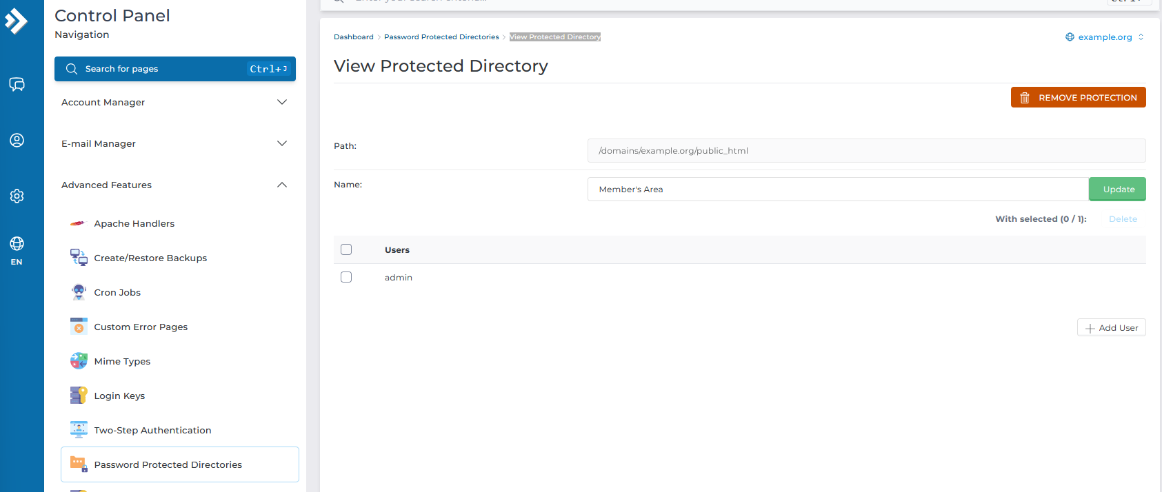 3. Πατάμε το κουμπί “+ADD PROTECTED DIRECTORY”.press add protected directory button